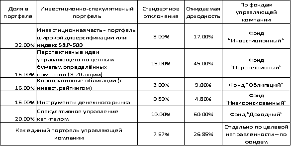 Стандартное отклонение по спекулятивному управлению капиталом в рассматриваемом в примере подходе (10%) зависит от процентной доли рискового капитала спекулятивной части портфеля  (20%). В случае ошибки управляющих или сбоев в работе торговой стратегии, управляющая компания не допускает снижение рискового капитала более чем на 50%. В реальности данные допущения могут быть разными, и зависят от степени риска, предпочтений и торговых стратегий компании. Среднеквадратичные же отклонения по инвестиционной части в данном примере взяты из статистического расчёта 3-ёх лет. Поскольку время удержания ценных бумаг напрямую влияет на среднеквадратичное отклонение, то варианты временного диапазона также зависят от целей и задач управляющей компании.  (таблица 2)